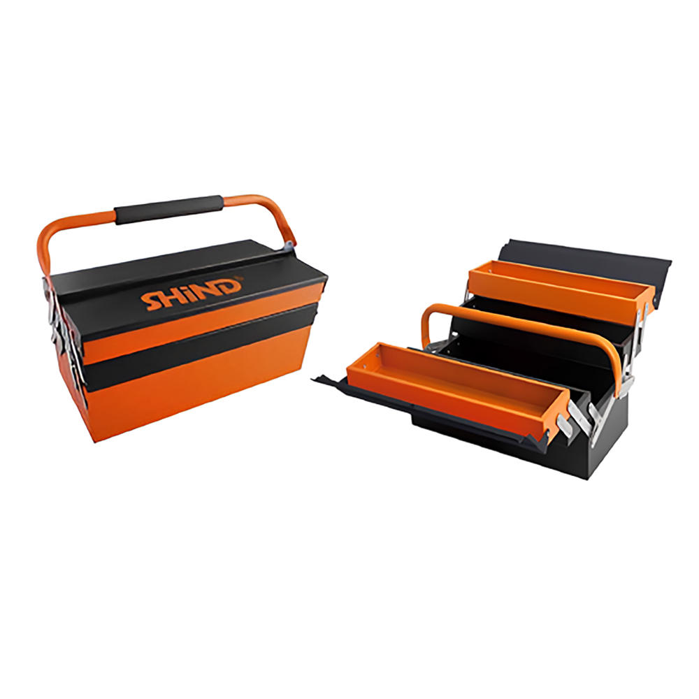 Επαγγελματική πτυσσόμενη εργαλειοθήκη από ενισχυμένο χάλυβα, με 5 ανεξάρτητους χώρους αποθήκευσης. Διαθέτει στιβαρή κατασκευή για αντοχή σε μεγάλα βάρη, διπλές λαβές μεταφοράς και δυνατότητα κλειδώματος, αποτελώντας την ιδανική λύση για το συνεργείο, το εργοτάξιο ή το γκαράζ.
