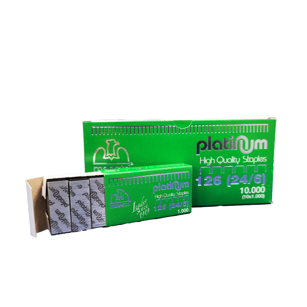Συρραφίδες (σύρματα) μεγέθους 126 (26/6) με ειδική επιψευδαργυρωμένη επίστρωση Platinum. Η συσκευασία περιέχει 1.000 σύρματα εξαιρετικής σκληρότητας, προσφέροντας κορυφαία διεισδυτικότητα και αντοχή στην οξείδωση χωρίς τον κίνδυνο να λυγίσουν κατά τη χρήση.